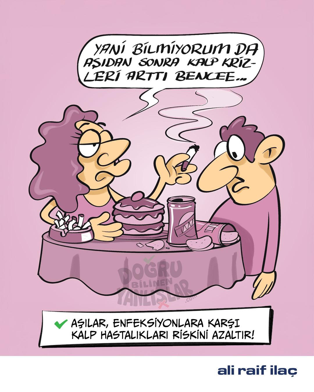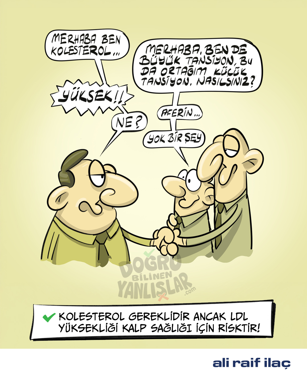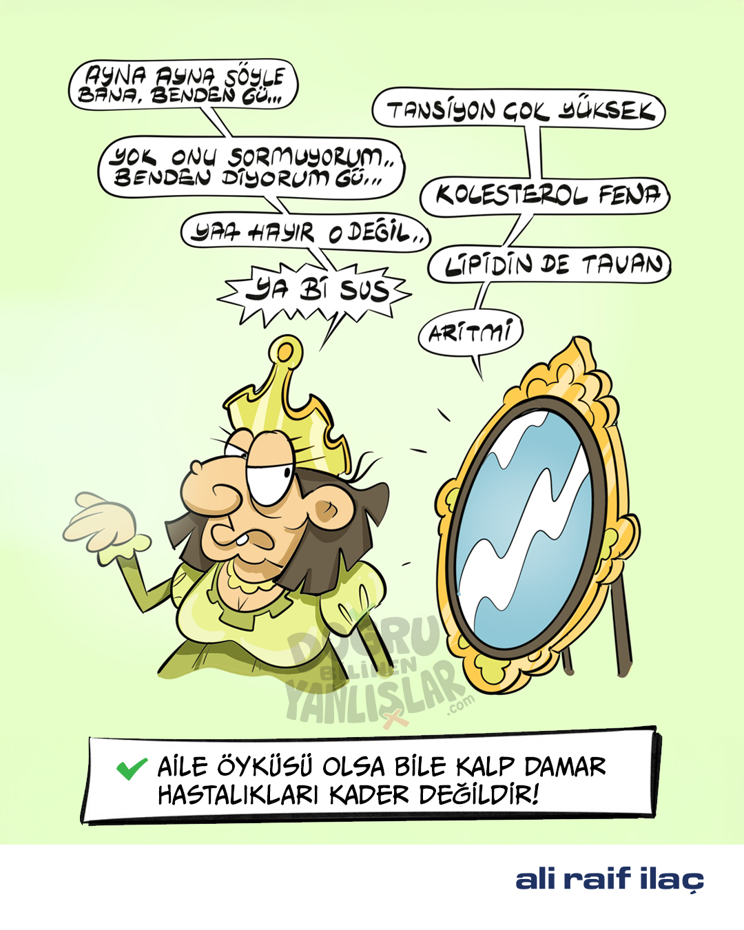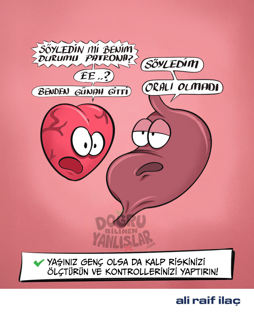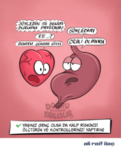 Kalp sağlığı alanındaki 60 yıllık güçlü birikimi ile Ali Raif İlaç, projeye koşulsuz destek veriyor. Sağlık Bilimleri Üniversitesi İstanbul Haseki Eğitim ve Araştırma Hastanesi Kardiyoloji Anabilim Dalı Öğretim Üyesi ve Klinik Şefi Prof. Dr. Erdal Belen’in bilimsel danışmanlığında hazırlanan projede, kalp sağlığıyla ilgili yanlış inanışlar mizahın gücüyle ele alınıyor. Her bir karikatür yerleşik kanıları sorgulatırken, bilimsel makale yanlış bilgiye açıklık getiriyor. Kalp krizi belirtilerinden aşılara, tansiyon ve kolesterolde ilaç reddinden tetkik yöntemlerine, genç hastalardaki risk faktörlerinden spora kadar pek çok konu “doğru” ve “yanlış” olarak değerlendiriliyor. Merak ettiğiniz konulara göre makale içeriklerini okuyabilirsiniz.